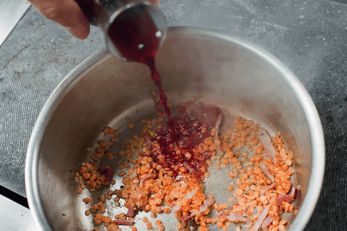 Thoroughly wash the gutted quail and leave it on a paper towel. Cut the bacon into thin strips, crush the garlic clove with a knife. Mash the pilati tomatoes with a potato masher, and cut the fresh ones in half. Rinse the red lentils in a sieve.