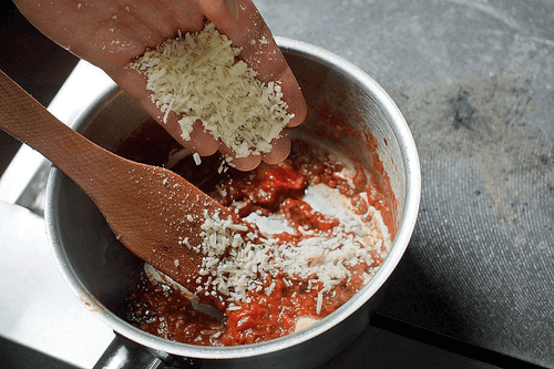 Send the peeled tomatoes to the saucepan, and remove the garlic and thyme. Keep the pot on the heat for a couple more minutes, stirring the contents. Add pepper. When the lentils reach al dente, remove from heat and add a cube of butter, and after it melts — grated parmesan. No need to salt — the bacon takes care of that.