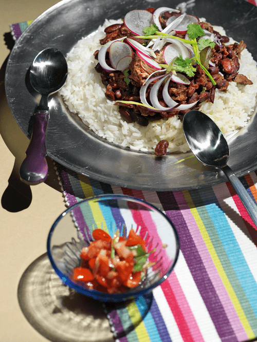 After two hours, add canned beans and simmer for another half an hour to an hour, then remove the pot from the heat, break the meat into pieces, and serve — with plain rice, for example, a salad of radish, onion, and cilantro, with sour cream, grated cheese, or tomatoes with onions. Or you can just use what you have and even do without rice.