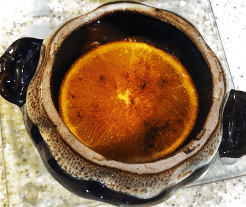 Cut a large orange in half, slice off one circle, and set it aside. Squeeze the juice from both halves of the orange into a small saucepan, add sugar, bring to a boil, and cook over medium heat for seven to ten minutes (the syrup should thicken slightly).