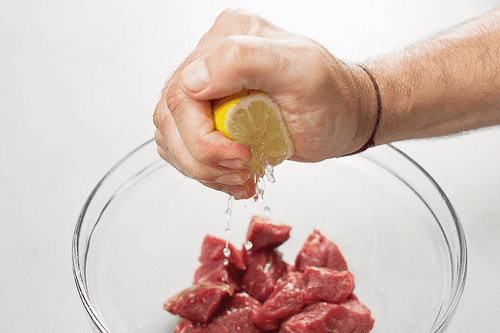 Cut the veal into small pieces (about 2x2 cm), place the pieces in a bowl, and squeeze the juice from half a lemon. Mix the meat thoroughly with the juice and let it marinate for thirty minutes.