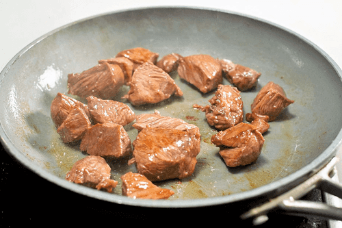 Heat a tablespoon of vegetable oil in a pan, add the cubed veal, and quickly fry on all sides until lightly browned. Finally, season with salt and pepper.