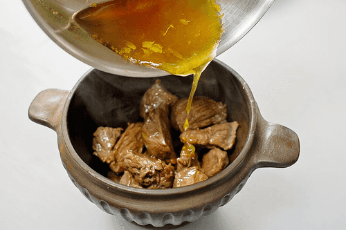 Transfer the fried meat to a small fireproof clay pot. Pour warm orange syrup over the veal.