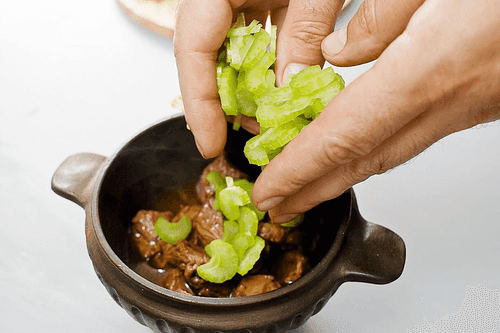 Peel the celery stalk with a sharp knife or vegetable peeler from the top hard layer, chop finely, and place it on top of the meat.