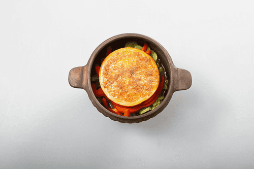 Place a slice of orange on top of the pepper (do not peel the zest — it will add aroma to the meat and vegetables), also brush with a little mustard and sprinkle with cinnamon.