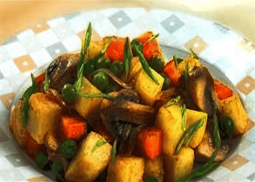 Peel the potatoes and cut them into cubes. Add the potatoes to the mushrooms and simmer covered until cooked (about 20 minutes).