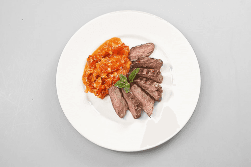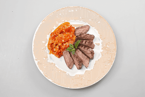 Arrange the sliced steaks beautifully on a plate — five to seven pieces per serving — along with the onion-tomato sauté. Drizzle the meat and vegetables with a little olive oil and garnish the dish with a sprig of fresh mint.