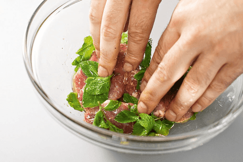 Cut the beef fillet into small steaks about 3 cm wide. Rub with salt and black pepper. Transfer the meat to a bowl, add mint leaves and a couple of teaspoons of olive oil. Mix by hand and let marinate for twenty to thirty minutes.