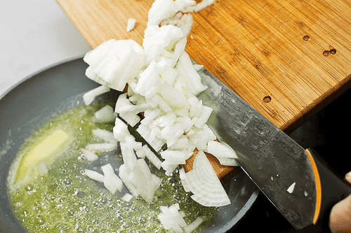 In a small pan, mix a teaspoon of olive and butter and heat well. Add finely chopped onion. Fry until golden, then add minced garlic. Stir and fry everything together for a couple more minutes.