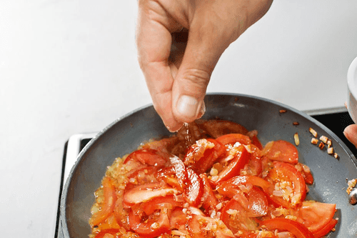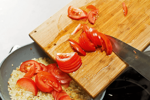 Slice the tomatoes into thin half-moon pieces and add them to the pan with the onion and garlic. Gently stir with a spatula, trying not to turn the tomatoes into mush, and simmer everything together for another three to four minutes.