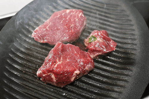 Heat a thick-bottomed skillet or grill pan over high heat and sear the beef pieces on both sides until a crust forms. The inside should remain rare.