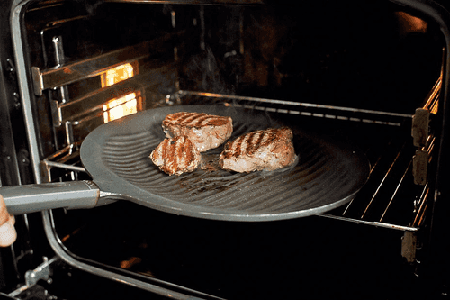 Preheat the oven to 180 degrees. Drizzle the meat with balsamic vinegar, a teaspoon of olive oil, and sprinkle with lemon zest. Place in the oven for seven to ten minutes, transferring the steaks from the pan to a baking dish if needed.