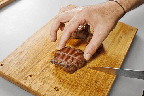 Remove the cooked steaks from the oven, transfer them to a cutting board, and let the meat rest for four to five minutes. Then, using a sharp knife, slice each steak into small pieces about 1–1.5 cm thick.