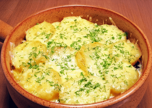 Grate the cheese on a medium grater. In a baking dish (any form will do - ceramic, clay, glass), layer half of the potatoes, sprinkle with a little salt and pepper. Grease with sour cream or mayonnaise.