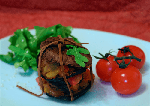 Now, from the obtained parts, you need to assemble the piccata. Assembly instructions: layer the scallop, a thin slice of Parma ham, a circle of eggplant, and vegetables. Repeat this monotonous action once more and crown the resulting tower with a third scallop. To prevent it from meeting the fate of the Leaning Tower of Pisa, tie the piccata with twine or another string that adequately responds to contact with food and heat. Repeat the described algorithm as many times as the desired number of servings.