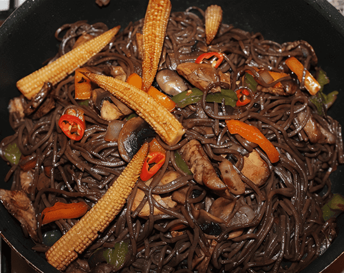 Buckwheat noodles with teriyaki chicken is a blend of delicate Eastern flavors and rich texture. The dish has roots in Asian cuisine, where buckwheat noodles are valued for their nutrition and deep aroma. Juicy chicken soaked in sweet-salty teriyaki sauce creates a harmony of flavors, while bell peppers and mushrooms add freshness and richness. A light spiciness from Tabasco and chili makes the dish expressive. It's perfect for a cozy dinner when you want something rich but not heavy. Serving with rings of fried chili pepper gives the dish an elegant look and adds a touch of heat, leaving a pleasant aftertaste. This is the ideal combination of Eastern traditions and modern gastronomy.