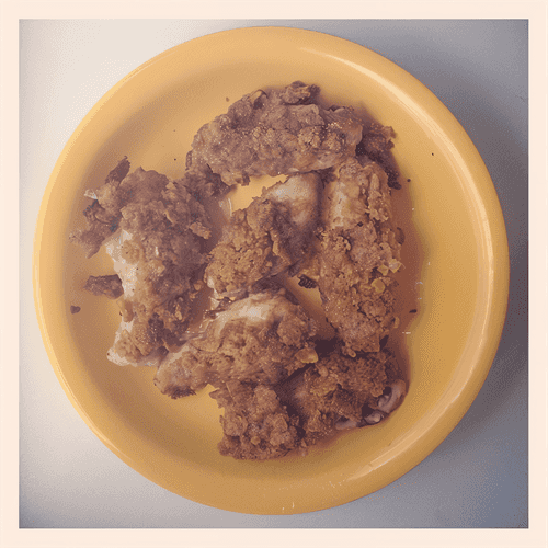 Make the breading. Crush the cornflakes and mix with flour, breadcrumbs, ginger, herbs, ground garlic, and a pepper mix.