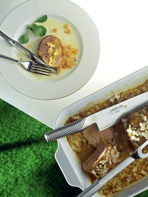 Wrap a piece of pork neck or loin into a roll and tie it with cooking twine along its length. Then, carefully but without excess, sprinkle the roll with ras el hanout (a Moroccan spice blend).