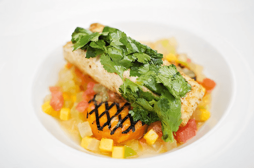 Fried halibut with fruits