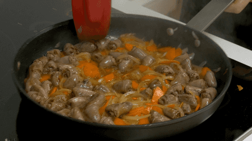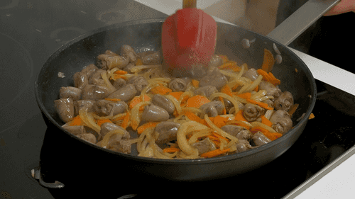 When a crust forms on the hearts, add onion and carrot. Fry for 5-7 minutes until the onion is golden.