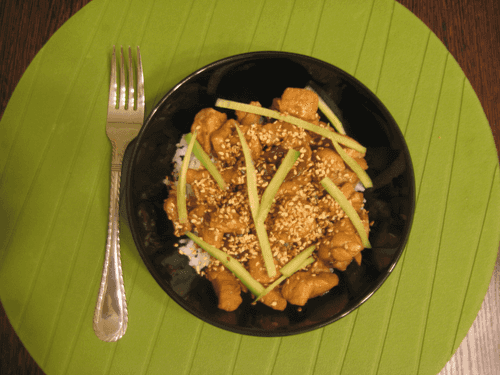 Place in a deep dish. First, pour the sauce (a small puddle 1-2 mm deep), then add the rice (do not mix!! whoever wants can mix when eating), then the chicken with mushrooms, on top - cucumber, then sprinkle with fried sesame.