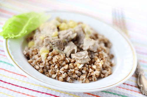 While the meat is stewing, cook buckwheat (1 cup of buckwheat to 2 cups of water - for 2-3 servings). Add rinsed buckwheat to boiling water, cook on medium heat for 15 minutes, add a piece of butter, turn off the heat, and let it steam under the lid for another 15 minutes.