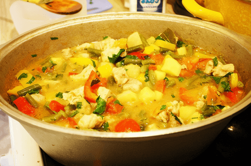25 minutes before the meat is fully cooked, add potatoes, zucchini, green beans, and bell peppers.