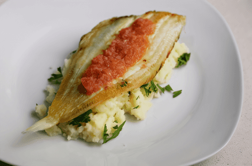 Fried flounder with mashed potatoes and tomato-pear sauce