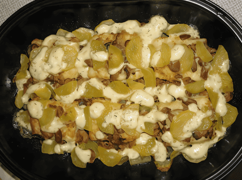 Potatoes with chicken and mushrooms, baked in milk