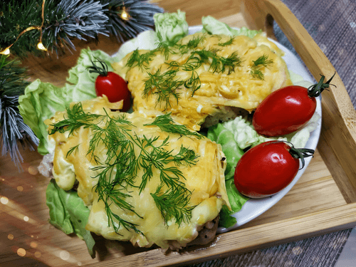 Meat French-style with mayonnaise is a luxurious dish of Russian cuisine that captivates with its tenderness and rich flavor. Despite its French name, it originated in Russia and became popular due to the simplicity and availability of ingredients. Juicy layers of pork infused with the aromas of freshly ground pepper and salt are covered with a layer of tender onions and then generously smeared with mayonnaise, which turns into an appetizing crust when baked. The finishing touch is a generous layer of grated hard cheese that adds a creamy taste and pleasant stretchiness to the dish. Served hot, sprinkled with fresh herbs, it makes for not only a delicious but also an aesthetically appealing meal. It pairs perfectly with mashed potatoes or fresh vegetables, creating a cozy and hearty dish for family dinners or festive tables.
