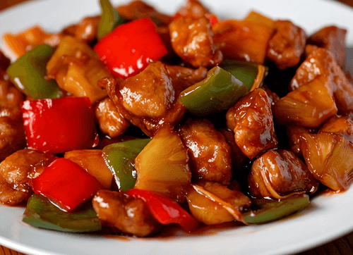 Sweet and sour pork is one of the most popular dishes in Chinese cuisine, combining a balance of vibrant flavors. It is believed to have originated in Cantonese gastronomy, where the combination of sweet and sour is traditionally used to add depth to dishes. Tender pieces of pork are covered with an appetizing caramelized crust, while juicy vegetables combined with pineapple and balsamic vinegar create a unique flavor harmony. Each spoonful of this dish is a play of contrasts, where the sweetness of pineapple and the tanginess of vinegar complement the rich taste of meat and spices. It is served with rice that absorbs the fragrant sauce, making each portion truly hearty. This dish not only delights the palate but also brings a sense of comfort through its rich textures and harmony of ingredients.
