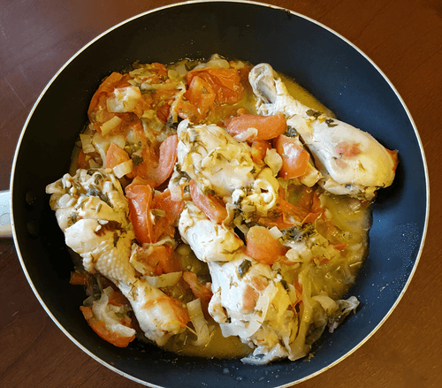 Then add chicken meat, salt, pepper, finely chopped tomato wedges, crushed garlic, vinegar (or lemon juice), and a small amount of water (or broth) to the onion.