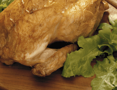 Place the chicken on a greased baking tray breast side up, wrapping the wing tips in foil. Bake at 200 degrees until cooked, about 40 minutes.
