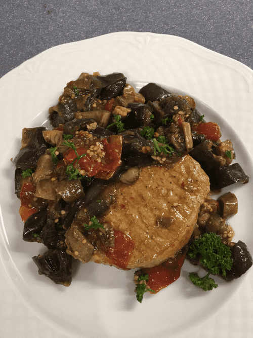 Pork baked with mushrooms, tomatoes and eggplants