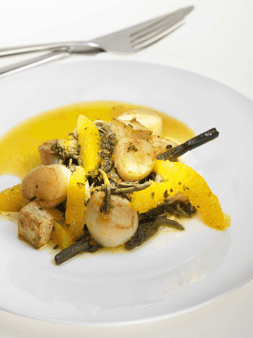 Add the remaining olive oil, orange slices, and onion to the warm sauce, followed by celery, scallops, and fern. Gently mix and serve on plates.
