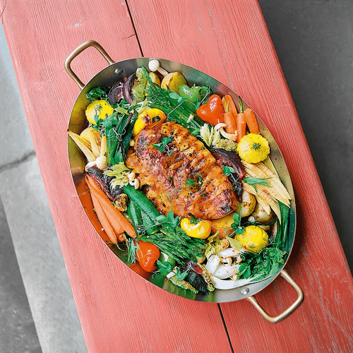 In a large baking dish, place the vegetables you like: small pattypans, zucchini, carrots, corn, and potatoes (better to boil them first), regular chicory and asparagus, green beans, and sweet peppers. You can add shimeji mushrooms.
