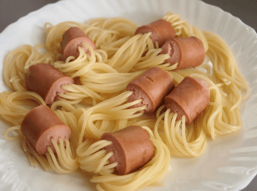 Spaghetti with sausages is a simple yet original dish that is sure to bring a smile. It is often prepared for children as the unusual way of combining ingredients makes the process fun and engaging. Rooted in European cuisine, this recipe combines the tenderness of boiled sausages with the firmness of spaghetti, creating an interesting contrast of textures. The harmonious blend of soft meat notes and light wheat aroma makes it versatile and suitable for a quick home dinner. The dish easily complements sauces—tomato, creamy, or cheesy—adding new flavor nuances. Its simplicity in preparation makes it ideal for those wanting to quickly and deliciously feed their family or simply treat themselves to something unusual.