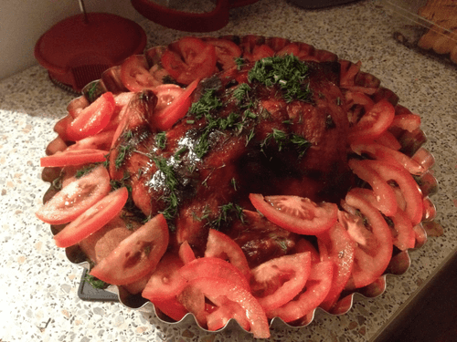 Baked chicken with potatoes is a cozy dish of European cuisine that combines the rich flavor of juicy meat infused with aromatic spices and the tenderness of baked potatoes. The marinade made from soy sauce and spices gives the chicken a pronounced taste, while the onion adds a light sweetness. This dish is perfect for a family dinner when you crave something hearty and homey. After slow baking in the oven, the meat becomes tender and juicy, while the potatoes turn golden and appetizing. A garnish of fresh dill and tomatoes adds fresh notes and makes the presentation especially appealing. Baked chicken with potatoes is a classic that always delights with its taste and simplicity of preparation.