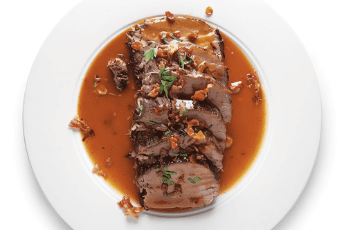 Cook, stirring constantly, until lightly browned, about 5 minutes. Add the sauce in which the beef was, raisins, and lemon juice to the pan. Return the beef to the saucepan with the sauce, bring to a boil, cover, and simmer until the sauce reduces slightly, about 10 minutes. Slice the beef thinly, place on a plate, drizzle with sauce, and sprinkle with bacon and parsley.