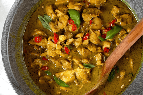 Chicken in green sauce is an exquisite dish that combines the aroma of spices with the tenderness of coconut milk. Its roots can be found in European culinary traditions, but the influence of Asian notes makes it truly unique. The rich flavors of cilantro, lime, and ginger are complemented by a light spiciness from chili, creating a harmony of freshness and warmth. The chicken soaked in the aromatic sauce remains juicy and tender, while the coconut base adds softness. This dish pairs excellently with rice, allowing each piece to absorb the richness of the sauce. It is suitable for both a cozy dinner and a festive feast, offering a rich gastronomic experience.