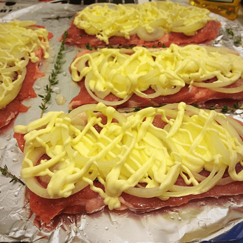Then slice the mushrooms and place them on the cutlets as well.