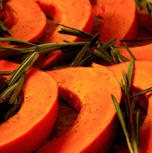 Preheat the oven to 180 degrees. Line a baking tray with parchment paper and place the pumpkin on it. Season with salt and pepper, add rosemary sprigs. Bake in the oven for 20-25 minutes.