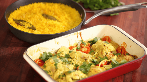 Chicken in yoghurt sauce with curry, with a side dish of rice