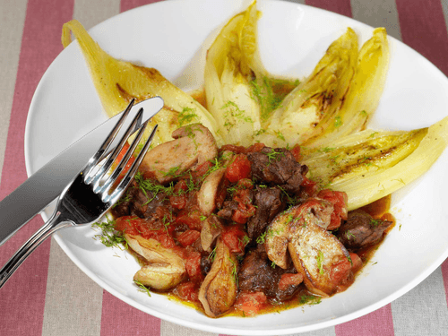 Serve the stew with baked chicory, sprinkled with finely chopped dill.