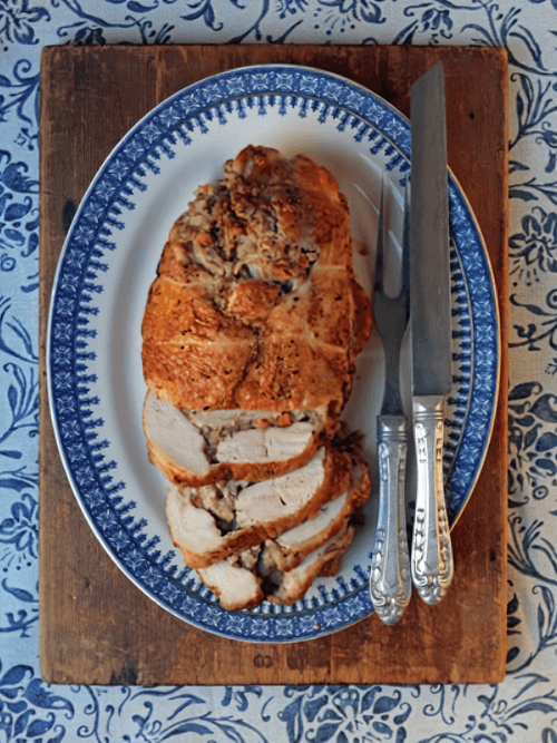 Sear the roll in olive oil on all sides until golden brown and transfer to a baking sheet or a small roasting pan. Place in the oven for 30-45 minutes (calculating 30 minutes per 1 kg of fillet).