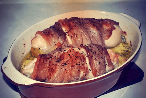 Stuff the breasts with filling. Wrap in slices of bacon or pork belly. Sprinkle with pepper on top.