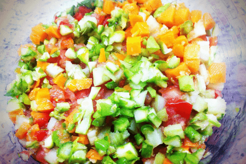 Chop the vegetables into small cubes, add salt and pepper.