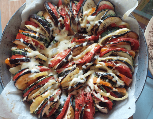 Caterpillar Ratatouille is a bright and unusual dish inspired by classic French ratatouille but adapted to Armenian taste traditions. Its history stems from the desire to combine simple vegetable ingredients into a harmonious flavor ensemble. Eggplant, sweet pepper, zucchini, potatoes, and tomatoes are sliced thinly and layered to create a visual effect reminiscent of a caterpillar pattern. The dish is filled with rich aromas thanks to sea salt, black pepper, and a blend of wine and balsamic vinegar. The baked vegetable mix acquires a soft texture and multifaceted taste – from the sweetness of the pepper to the slight acidity of the vinegar. It can be served as a side dish to meat dishes or as a light appetizer perfect for summer evenings or festive tables.