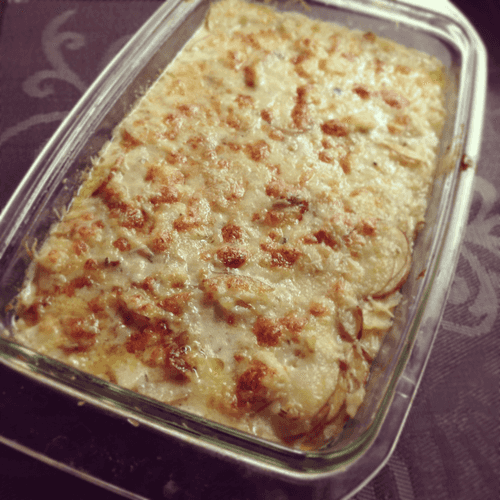 Once ready, transfer the contents of the pan to a greased baking dish and place it in a preheated oven at 200 degrees. Cook until a golden crust forms.