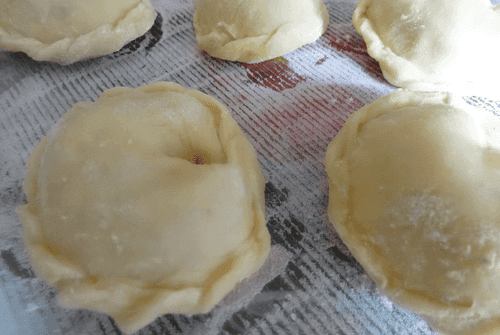 Divide the dumpling dough into 4 parts. Roll each part thinly (the dough rolls out well and doesn't tear) and cut out circles with a glass. Place as much filling as possible and pinch.